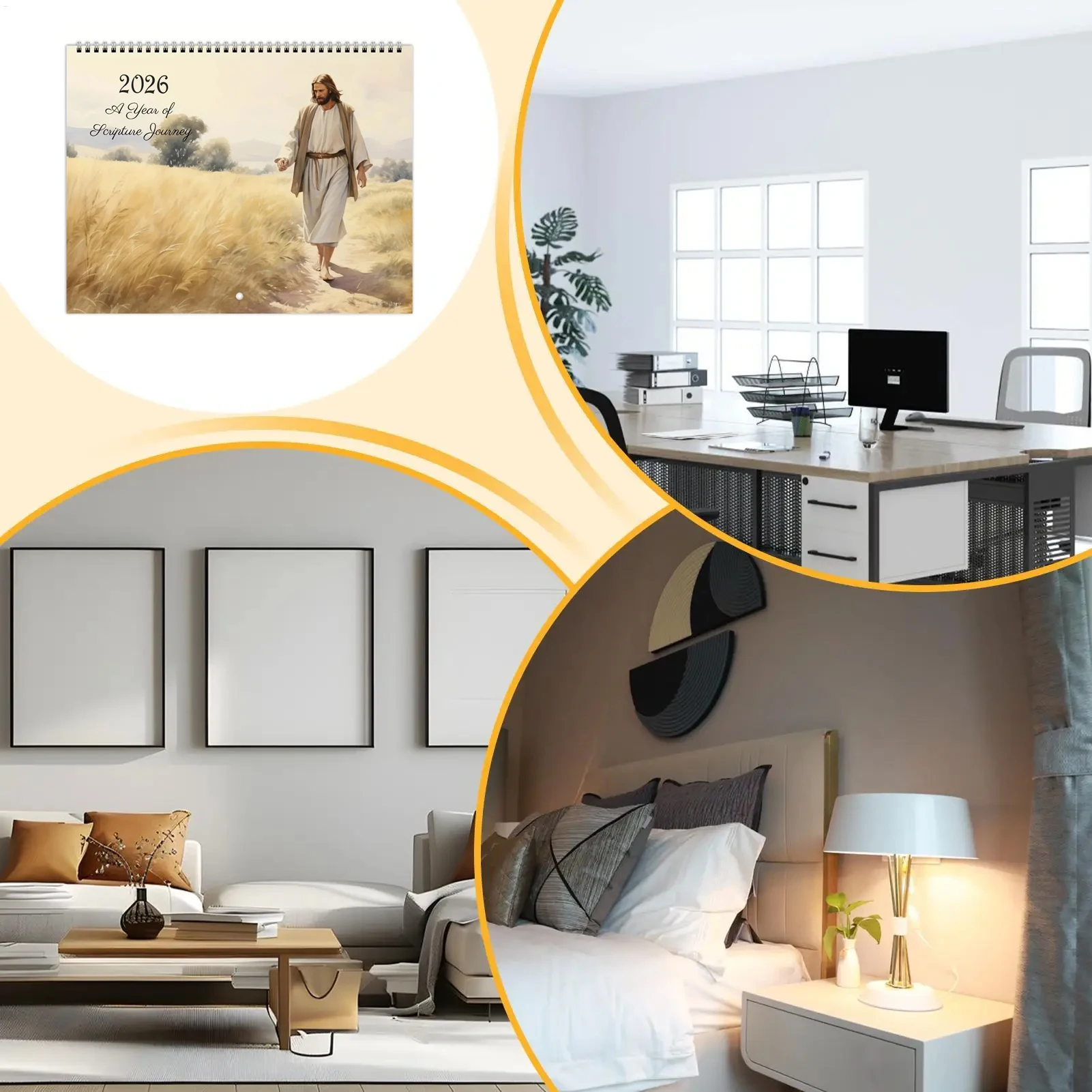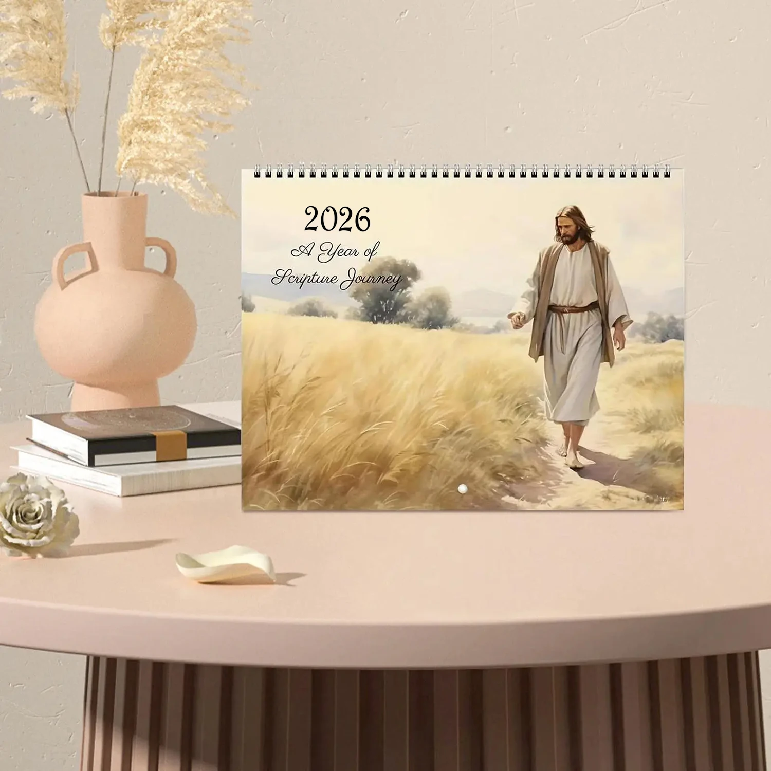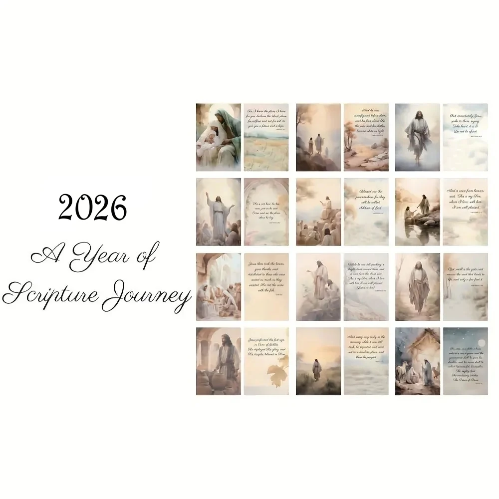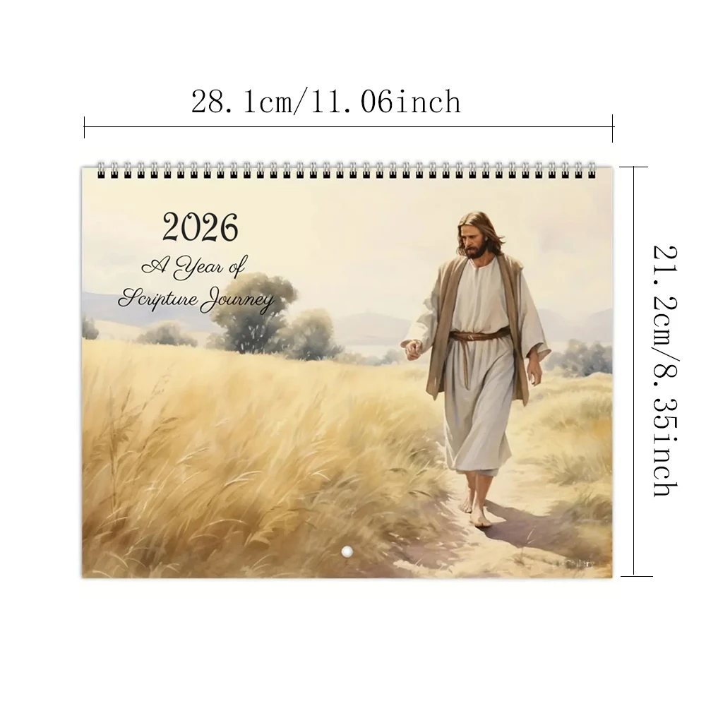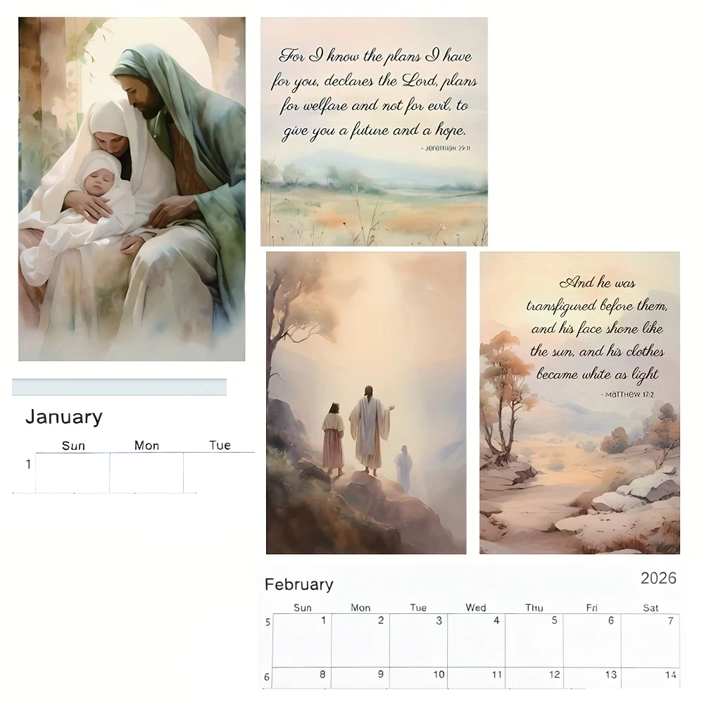 This 2026 travel calendar features inspiring illustrations of Jesus paired with scenic journeys. Each month presents faith-filled artwork designed to uplift and encourage. The travel theme symbolizes spiritual growth and life’s journey with faith. Beautiful religious illustrations add meaning to everyday planning. The calendar helps keep track of dates while offering daily inspiration. Its clear layout makes monthly scheduling easy and practical. The artwork enhances home décor with a peaceful spiritual presence. This calendar is suitable for living rooms, offices, or prayer spaces. It serves as both a functional planner and decorative piece. The faith-based imagery promotes reflection and hope throughout the year. This calendar makes a thoughtful gift for believers and loved ones. It blends organization, art, and Christian inspiration into one meaningful calendar.