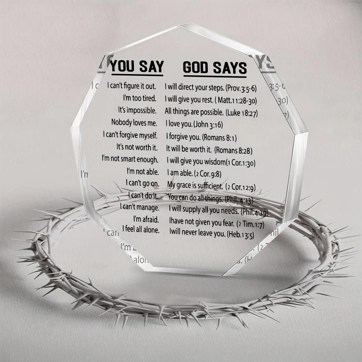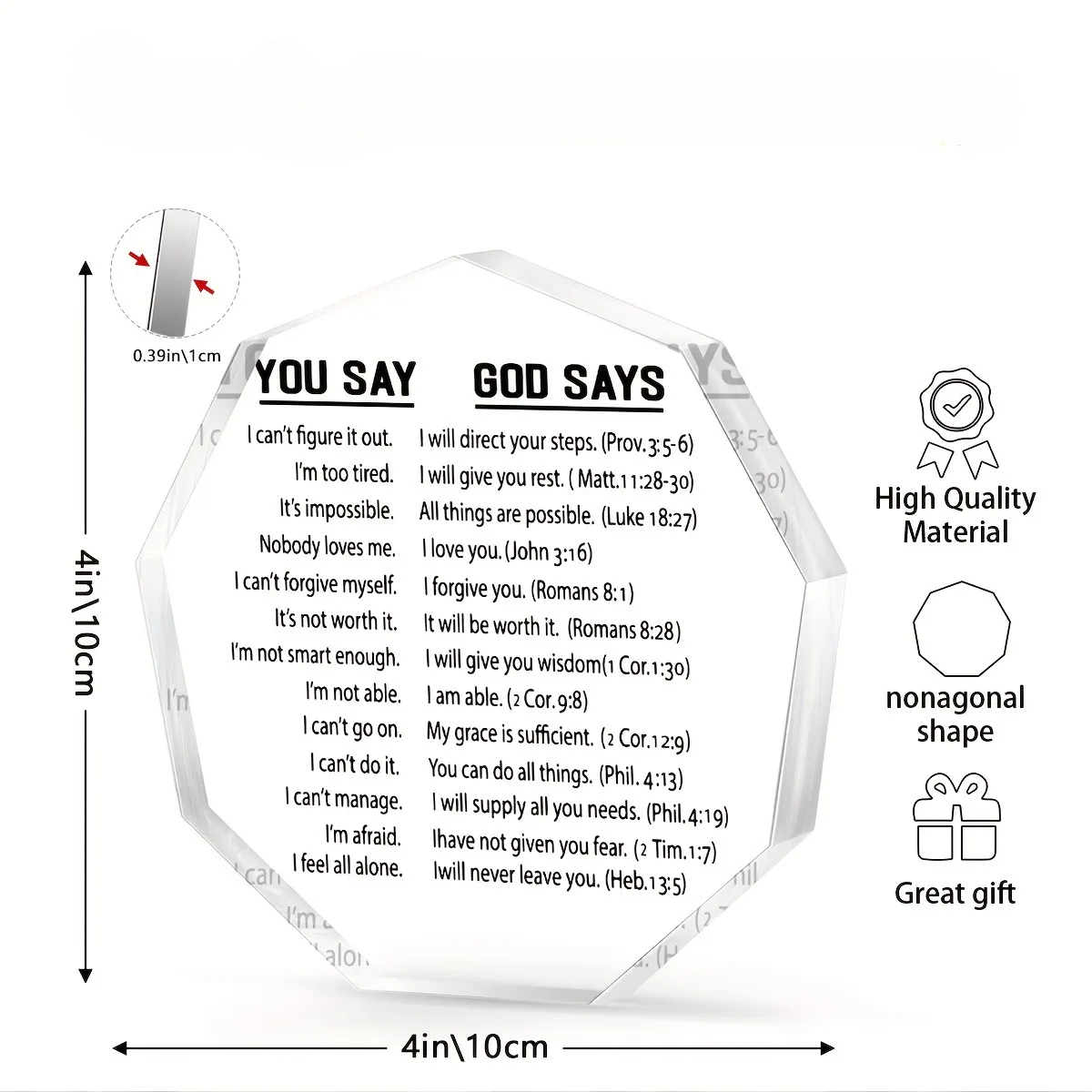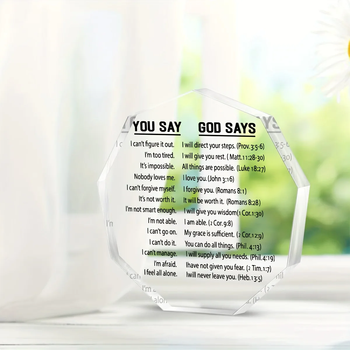 This acrylic scripture card offers a beautiful way to share encouragement and faith. Its clear, sturdy design highlights an uplifting Bible verse. The message brings comfort and positivity to anyone who receives it. Its compact size makes it easy to display on a desk or shelf. The card is ideal for daily motivation and reflection. It makes a thoughtful gift for a best friend who values spiritual inspiration. The simple style blends well with any home or office decor. It serves as a meaningful reminder of hope and strength. The encouraging verse helps brighten difficult days. This item is perfect for birthdays, holidays, or just-because moments. The acrylic material provides long-lasting quality and clarity. This scripture card is a heartfelt way to show love, support, and faith.