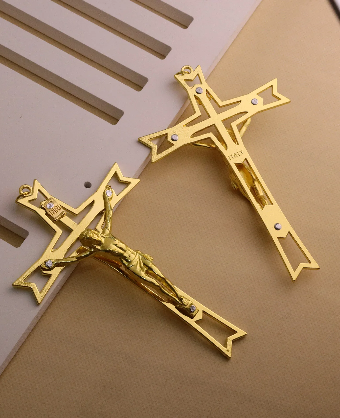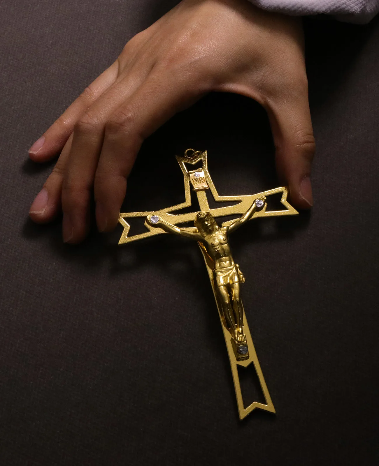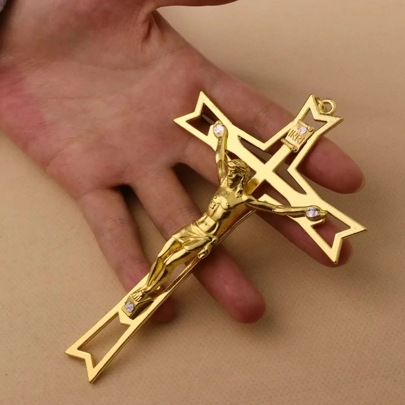 This crucifix decor features a meaningful hand holding the cross with Christ. The design symbolizes faith, blessing, and spiritual protection. The INRI detail adds traditional religious significance. Its craftsmanship highlights reverence and devotion. This piece works well as wall decor in homes or churches. It can also be displayed in prayer corners or sacred spaces. The ornament serves as a daily reminder of faith and strength. Its compact size allows for easy hanging or placement. The design blends well with both classic and modern religious decor. It makes a thoughtful gift for religious occasions or celebrations. The piece offers comfort and spiritual inspiration. This crucifix decor is a powerful symbol of belief and devotion.