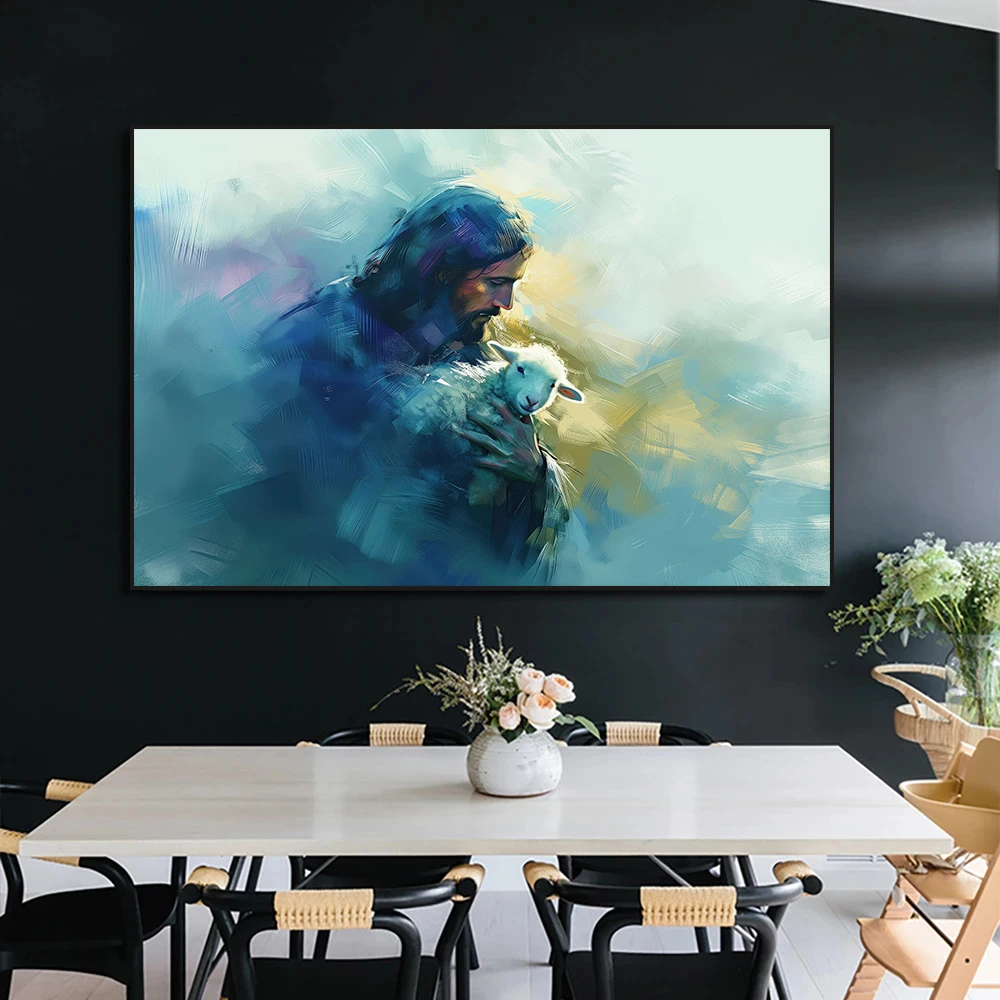 This wall art beautifully depicts Jesus with the lost sheep, symbolizing love and redemption. The artwork reflects the powerful message of leaving the ninety-nine to save one. It serves as a reminder of compassion, faith, and divine care. The design is suitable for living rooms, prayer spaces, or bedrooms. The image adds warmth and spiritual meaning to home decor. Its thoughtful illustration encourages reflection and hope. This piece blends artistic beauty with Christian symbolism. It works well as a focal point or part of a faith-inspired gallery wall. The artwork complements a variety of interior styles. It is ideal for personal devotion spaces or church environments. This print also makes a meaningful gift for believers. The artwork offers inspiration, comfort, and a strong expression of faith.