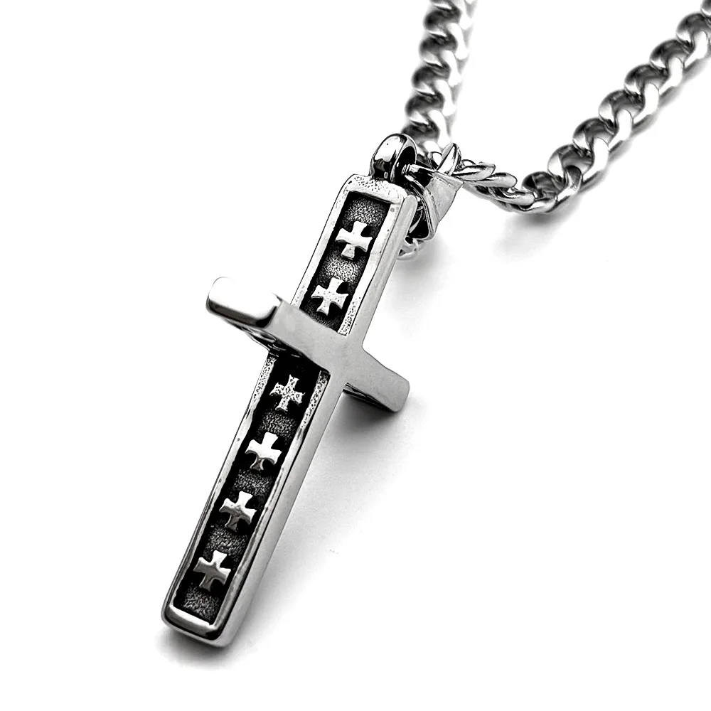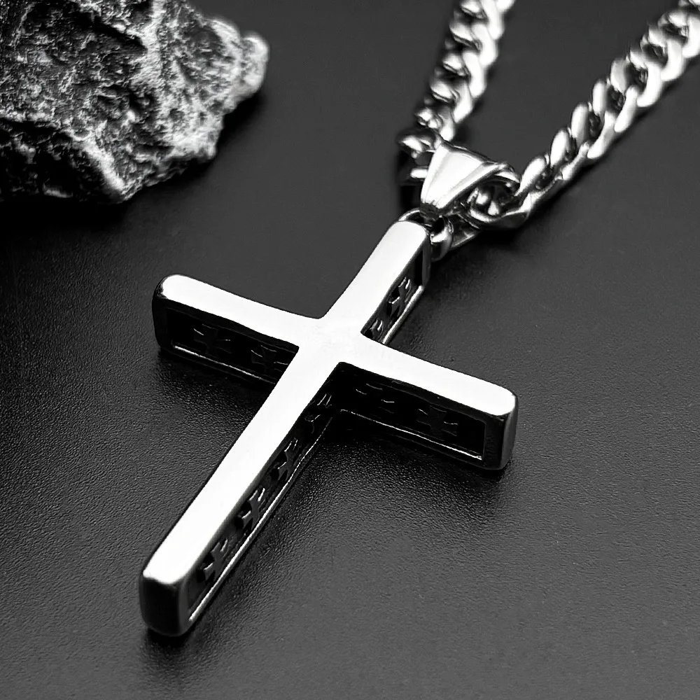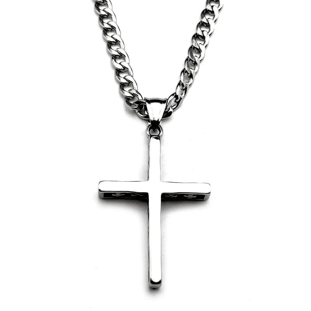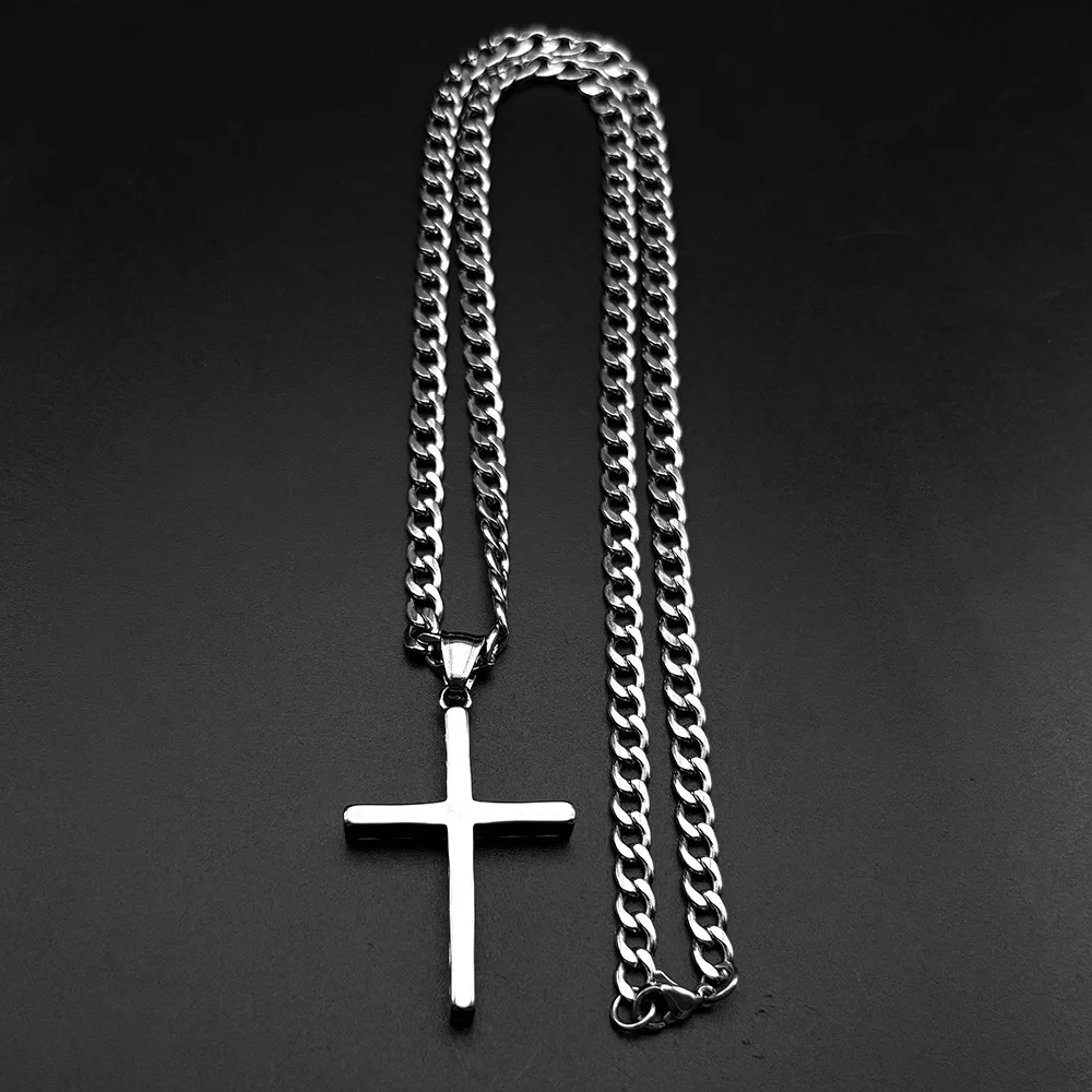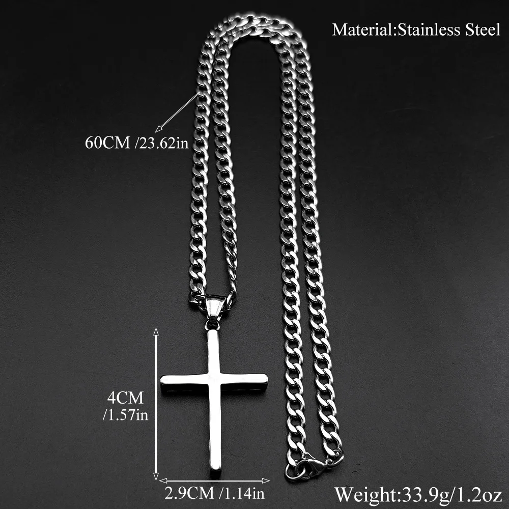 This stainless steel cross necklace is a striking accessory for men. Crafted from durable 316L stainless steel, it resists tarnish and scratches. The solid cross pendant features a polished finish for a sleek look. It hangs on a classic Cuban link chain for added style. The necklace is lightweight yet feels substantial on the wrist. Its timeless design complements casual and formal outfits. The Cuban link chain ensures a secure and comfortable fit. This piece makes a meaningful gift for religious or fashion-conscious individuals. It works perfectly for daily wear or special occasions. The polished stainless steel adds modern sophistication. Its versatile design makes it suitable for layering with other jewelry. This necklace combines faith, fashion, and durability in one accessory.